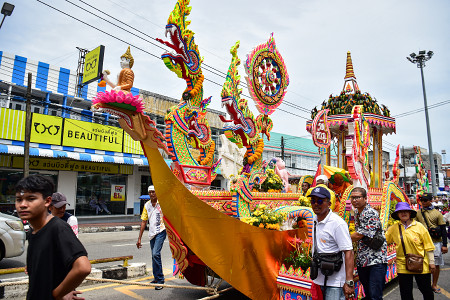 8日、タイ南部ナラティワート県で行われた仏教の修行期の終わり(安居明け)を祝うパレード。僧侶の修行は7月から3カ月間にわたり、毎年この時期に色とりどりの山車が街を彩る。 【AFP時事】
