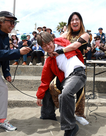 NPO法人「海さくら」が主催するごみ拾いが18日、神奈川県藤沢市の片瀬海岸で開かれた。プロレスラーのジャガー横田さんも参加。ごみを回収したファンの男性にプロレス技をプレゼントし、会場を盛り上げた。 【時事通信社】